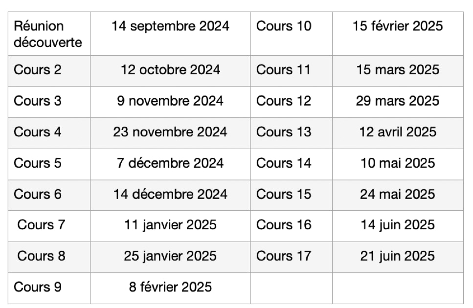 17 séances de deux heures réparties sur 7 mois, le samedi de septembre à juin