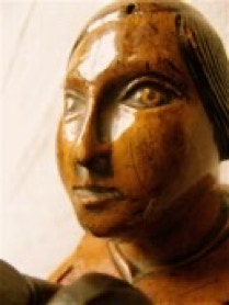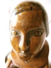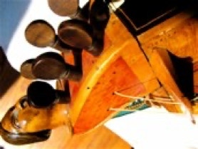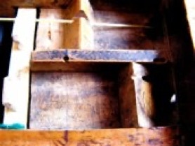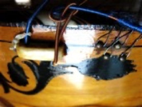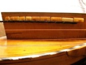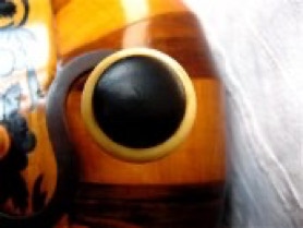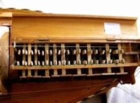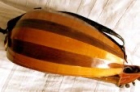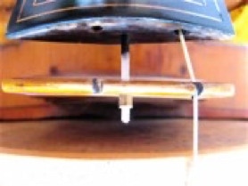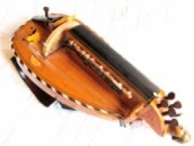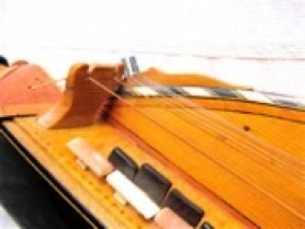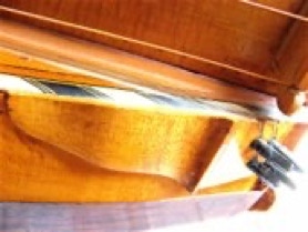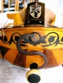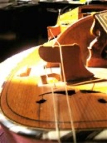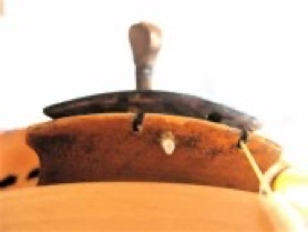 Cette vielle à roue de facture typique de la lutherie de Jenzat (03) a été restaurée fidèlement en 1981. Elle présente des chevilles en bois, et une décoration modeste attestée par la fleur de nacre en négatif sur le cordier.
